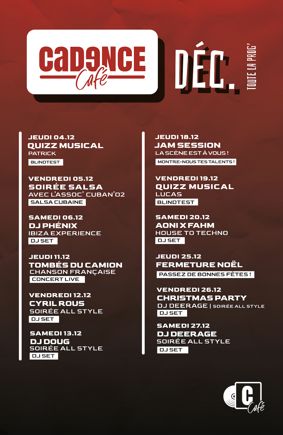 Découvrez la nouvelle programmation mensuelle du Cadence Café et préparez-vous à vibrer au rythme de nos soirées exceptionnelles !