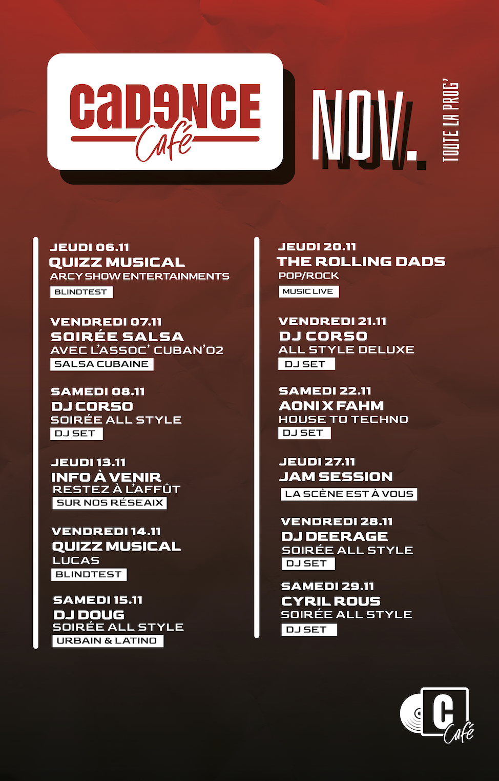 Découvrez la nouvelle programmation mensuelle du Cadence Café et préparez-vous à vibrer au rythme de nos soirées exceptionnelles !